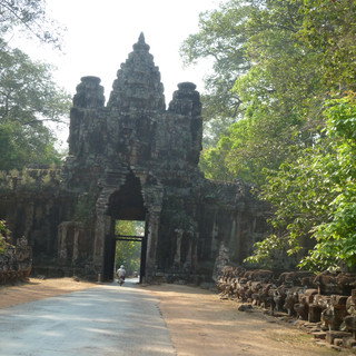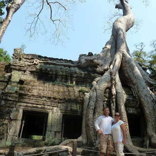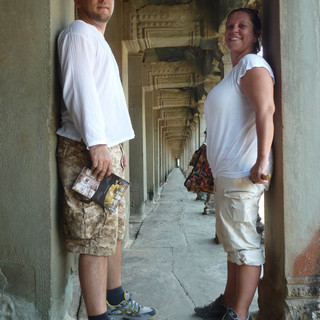 Erst um 11:00 bestellen wir unseren Tuk-Tuk Fahrer, damit er uns für diesen Tag durch den kleinen Rund-Gang der tempel von Angkor führt. Nachdem wir pünktlich abgeholt werden machen wir uns Richtung Tempelanlagen auf und halten vorher noch beim Ticketcenter wo wir 40$ bezahlen für einen 3-Tages-Pass (2 Tage gibt's natürlich nicht) und besuchen als erstes Angkor Wat. Dort angekommen lauert uns ein Amateurführer auf und nach einigen Preisverhandlungen einigen wir uns darauf, dass er uns 2,5 Stunden durch diese Haupttempel führt. Er erklärt uns in relativ gutem Englisch die Geschichte und bringt uns zu den Hotspots die wir wahrscheinlich alleine nicht gefunden hätten (z.B. zur einzigen von tausenden Apsara (=Tänzerinnenfiguren) die auch mit den Zähnen lächelt), er betätigt sich auch als leidenschaftlicher Fotograf, womit wir auch ganz zufrieden waren. Die Tempelanlagen sind generell gut besucht vor allem von Chinesen und Japanern die teilweise mit drei Kameras bewaffnet hier durchziehen und alles knipsen was nur geht – ohne Rücksicht auf andere Besucher, somit etwas nervig. Nachdem wir durch diesen Haupttempel geschlendert sind marschieren wir noch durch die Ostallee wo plötzlich einige Äffchen auftauchen. Einer ging Petra von hinten an die Wäsche und konnte aber mit einem Fächerschlag abgeschüttelt werden, hungrig die kleinen biester, aber auch ein bissl lieb… Unser Tuktukfahrer bringt uns anschliessend zum Ta Phrom-Tempel bei dem auch der Film Tomb Raider gedreht wurde, ein sehr detailreicher und von Bäumen überwucherter Ort. Sehr idyllisch, wenn die oben genannten Knipser nur nicht da wären. Danach besuchten wir in Angkor Thom die Elefantenterrasse, die früheren Königsgemächer mit zwei älteren Tempeln Phimeanakas und den Baphuon der nur von Stephan erklommen wurde und den Bayon, einen sehr bekannten, großen und sehr interessant verwinkelten Tempelbau mit 54 Türmen wovon auf jedem 4 Gesichter zu finden sind(der 2. Größte nach Angkor Wat). Abschliessend rät uns der Tuktukfahrer noch den Sonnenuntergang auf dem Tempelberg Phnom Bakheng zu beobachten, es soll sehr idyllisch sein die Sonne zu beobachten. Wir mussten zu Fuß hinaufwandern, was etwas mühsam war. Oben angelangt warteten schon hunderte auf das Naturschauspiel und aberhunderte kamen noch nach, es wurde als immer mehr antiidyllisch und nach einigen Fotos beschlossen wir vorzeitig wieder runterzuwandern, da wir mit dieser Menschenmasse (Japaner, Chinesen, Amerikaner,…) nicht gemeinsam den ca. 3 Meter breiten Weg hinunterrennen wollten. Kein schlechter Einfall, das Verkehrschaos unten blieb für uns aus. Zum Tagesabschluss nutzten wir noch den erfrischenden Hotelpool und machten uns dann auf den Weg zu den Nightmarkets um gutes Essen aufzuschnappen. Etwas früher gingen wir ins Bett, da wir morgen den berühmten Sonnenaufgang in Angkor Wat sehen wollten…